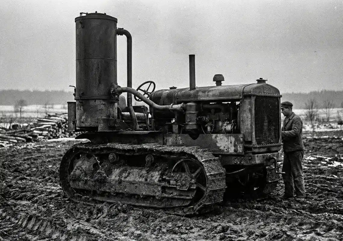 Bild: Hier siehst Du einen schweren Kettenschlepper aus dem Jahr 1933, der durch einen markanten Holzgaserzeuger an der Seite für den Betrieb unter Brennstoffmangel umgerüstet wurde. Bild ist KI-Generiert