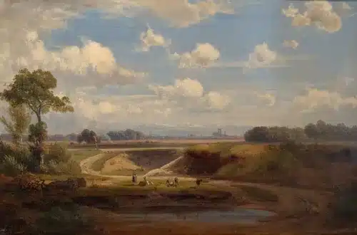 Und dann passiert etwas, das ich besonders liebe: Wenn man den Blick noch etwas länger hält, vielleicht eine Sekunde mehr als gewöhnlich, entdeckt man eine kleine Figur im Schatten des Baumes. Dort liegt der Hirte. Halb verborgen, ausgestreckt, wahrscheinlich schlafend. Er fällt fast nicht auf. Man könnte das Bild fünfmal anschauen und ihn jedes Mal übersehen. Aber wenn man ihn entdeckt, verändert er die ganze Szene. Plötzlich hat die Landschaft eine Geschichte, eine kleine Erzählung mitten im Alltag eines Menschen, der sich vielleicht für ein paar Minuten hingelegt hat, während seine Tiere friedlich um ihn herum stehen.