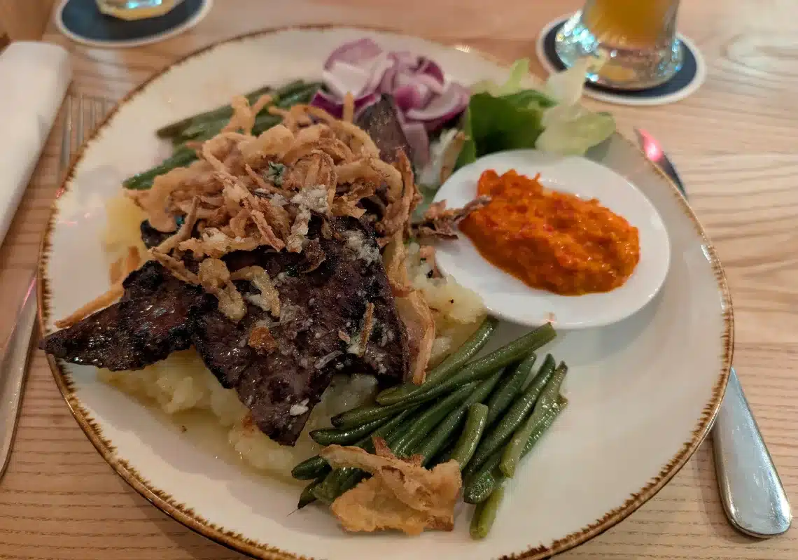 Beim Blick auf die Speisekarte wusste ich ziemlich schnell, was ich bestellen würde. Wenn ich Leber auf der Karte sehe, werde ich schwach – ein Gericht, das mich seit meiner Kindheit begleitet. Rinderleber, gebraten, mit Stampfkartoffeln und Bohnen. Nichts Ausgefallenes, aber etwas, das mich immer anspricht und das ich bevorzuge, wenn es in einem Restaurant angeboten wird. Vielleicht, weil es mich tatsächlich auch ein wenig an die Kochkünste meiner Mutter erinnert. Als der Teller kam, sah ich sofort, dass die Küche ihr Handwerk versteht. Die Leber war zart, nicht trocken, nicht streng, sondern so, wie sie sein soll. Ein ehrlicher Geschmack, der einen direkt abholt.