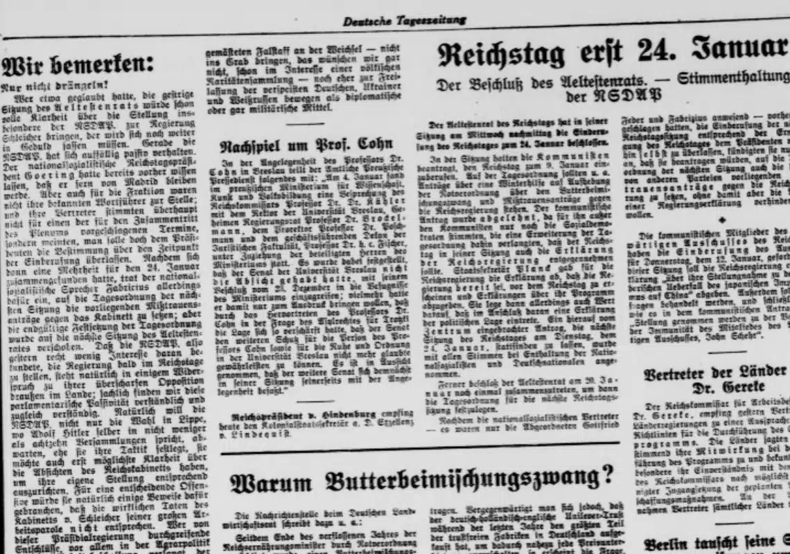 Wenn ich mir heute das vergilbte Blatt der „Deutschen Tageszeitung“ vom 5. Januar 1933 ansehe, dann spüre ich ein ganz merkwürdiges Kribbeln im Nacken. Es ist dieses Wissen um das, was nur wenige Wochen später kommen wird, während die Menschen damals noch im Dunkeln tappten. Das Leitthema, das mich heute am meisten fesselt, ist die fast schon gespenstische Ruhe im Reichstag. Unter der bissigen Überschrift „Nur nicht drängeln!“ verspottet der Kommentator die Nationalsozialisten und ihre aktuelle Taktik. Es ist faszinierend zu sehen, wie die NSDAP, die sonst so lautstark gegen die Regierung von Schleicher poltert, im Parlament plötzlich ganz kleine Brötchen backt. Man hatte mit einem sofortigen Angriff gerechnet, mit…