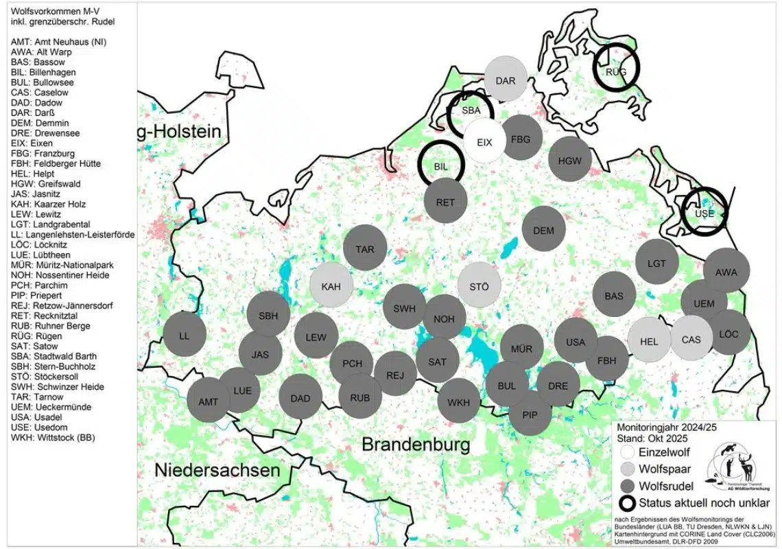 Die Zahl der Wolfsrudel in Mecklenburg-Vorpommern hat im Monitoringjahr 2024/25 deutlich zugenommen. Nach aktuellen Daten, die Ende September beim deutschlandweiten Großraubtier-Monitoringtreffen im Bundesamt für Naturschutz vorgestellt wurden, leben inzwischen 28 Rudel im Land – neun mehr als im Vorjahr. Hinzu kommen fünf Wolfspaare und ein territorialer Einzelwolf. In 24 der 28 Rudel wurde Nachwuchs bestätigt, insgesamt 93 Welpen. Einschließlich grenzübergreifender Vorkommen mit Schleswig-Holstein, Brandenburg und Niedersachsen ergibt sich eine Gesamtzahl von 37 Vorkommen, davon 34 in Mecklenburg-Vorpommern selbst.