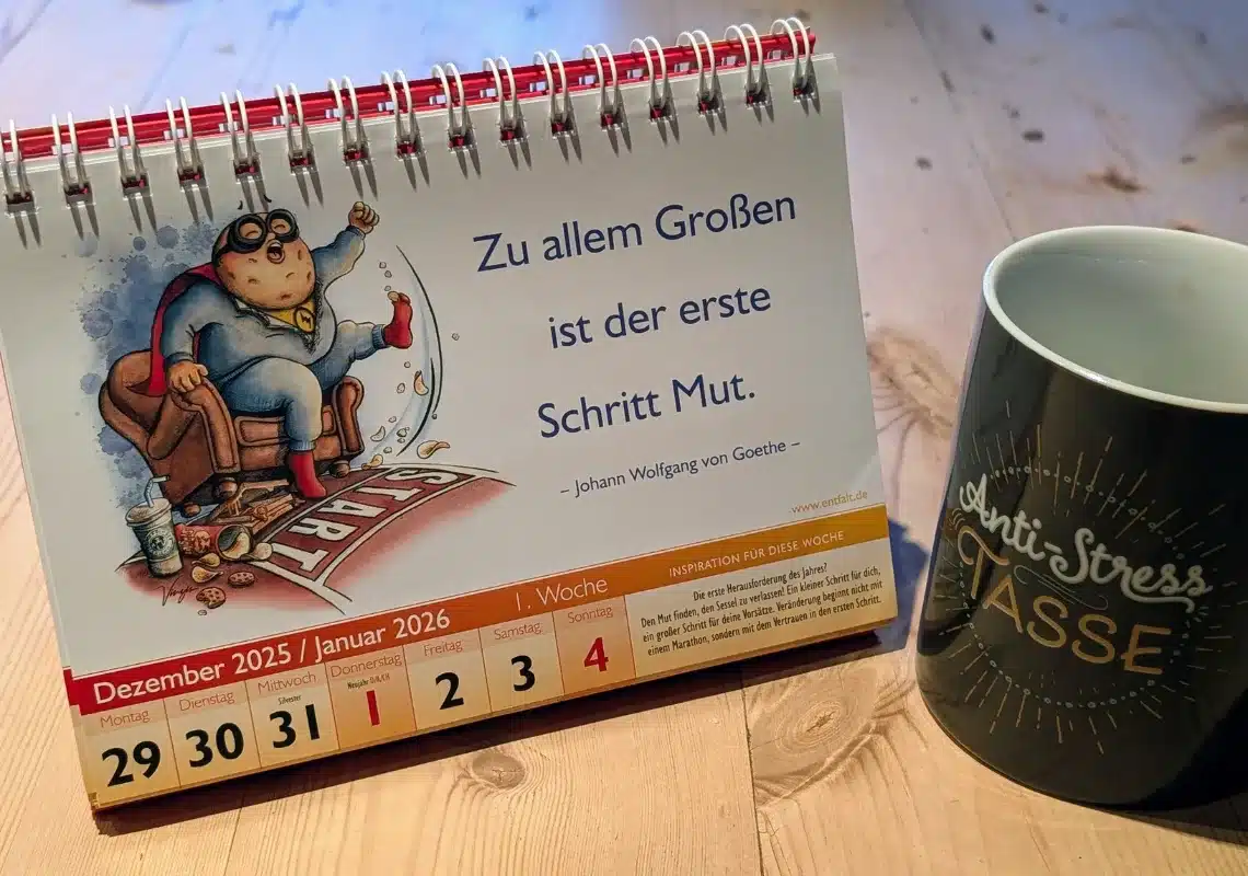 Ich sitze hier, schaue auf diesen Kalender, den ich zu Weihnachten bekommen habe, und irgendwie fühlt sich dieses erste Blatt an wie ein kleiner Spiegel. Erste Woche im Jahr, erstes Zitat, und dann ausgerechnet Goethe: „Zu allem Großen ist der erste Schritt Mut.“ Und ich merke sofort, wie sehr das trifft. Nicht so ein weichgespülter Spruch, den man einmal liest und dann weiterblättert, sondern etwas, das einem direkt in die Rippen piekst. Weil es genau da landet, wo es wehtut: beim Anfang.